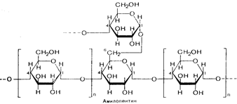 Молекулярный вес амилопектина достигает сотен миллионов Да. Амилопектин содержит примерно вдвое больше глюкозных остатков, чем амилоза. Он растворяется в воде лишь при нагревании под давлением и дает очень вязкие и чрезвычайно стойкие растворы. В молекуле амилопектина гликозидные остатки соединены a-гликозидными связями не только между 1 и 4 углеродными атомами, но и между 1 и 6, образуя таким образом разветвленную структуру. Компактность амилопектина обеспечивается интенсивным ветвлением цепей:
