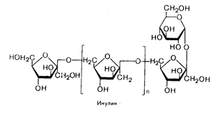 Другим представителем полисахаридов является инулин. Он относится к группе фруктозанов, т.е. полимеров, построенных из остатков фруктозы. Подобно крахмалу, представляет собой важное запасное вещество многих растений. Используется в основном для получения фруктозы. Молекулярный вес инулина составляет около 5-6 тысяч Да. Полимерная цепь инулина построена из 34-36 остатков фруктозы, соединенных b-гликозидной связью и заканчивается нередуцированным остатком a-D-глюкопиранозы:
