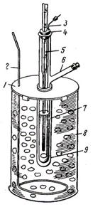 Пробирку с термометром и мешалкой вставляют в широкую пробирку 6, которая служит воздушным холодильником и обеспечивает равномерное охлаждение раствора в пробирке. Широкую пробирку вставляют в отверстие металлической крышки 7, которую надевают на толстостенный стеклянный сосуд 8 с охладительной смесью. В другое отверстие крышки 7 вставляют мешалку 9 для перемешивания охладительной смеси.