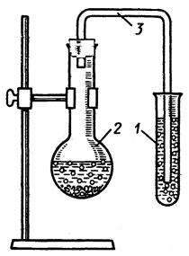Микроколбу 2 укрепите вертикально в штативе, положите в нее 3 - 4 маленьких кусочка мрамора, внесите 5 - 6 капель воды и 10 - 12 капель концентрированной соляной кислоты. Быстро закройте колбу пробкой с газоотводной трубкой 3, конец которой опустите в приготовленную заранее пробирку 1 с нейтральным раствором лакмуса. Отметьте изменение окраски лакмуса.