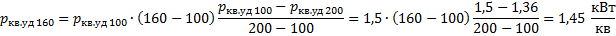 Гак как числа квартир, равного 160, в таблице нет, то, используя значения удельной расчетной электрической нагрузки электроприемников квартир жилых зданий для 100 и 200 квартир, определяется удельная нагрузка для 160 квартир: