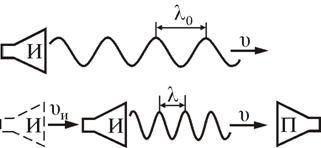 1) Пусть приемник звуковых волн П в газообразной (или жидкой) среде неподвижен относительно нее а источник И удаляется от приемника со скоростью