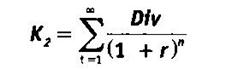 Коэффициент совокупной доходности акции может быть рассчитан по формуле текущей стоимости, под которой понимается дисконтированный поток денежных средств, которые акционер получит в виде дивидендов за период владения акцией. В этом случае коэффициент совокупной доходности акции имеет следующий вид: