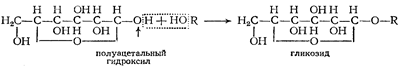 Полуацетальный гидроксил отличается гораздо большей реакционной способностью, чем остальные спиртовые гидроксилы. Поэтому он легко взаимодействует с гидроксильными функциональными группами других соединений с образованием гликозидов: