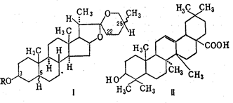 4. Сапонины. В растениях всегда находятся в виде гликозидов. Их агликонами (сапогенинами) служат либо стероидные структуры - производные циклопентанпергидрофенантрена (1), либо тритерпеновые (II):