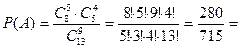 Пример 10. В группе 13 студентов, среди которых 8 отличников. По списку наудачу отобраны 9 студентов. Найти вероятность того, что среди них пять отличников.