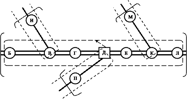 Схема железной дороги Н с указанием границ и тяговых плеч работы локомотивов приведена на рисунке 1.1. Полигон дороги включает в себя двухпутное направление Б – Л и однопутные участки В – И, Д – П, К – М. На дороге имеется десять технических станций, которые являются также пунктами смены локомотивных бригад.