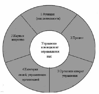 В Словаре иностранных слов «менеджмент» переводится на русский язык как управление производством и как совокупность принципов, методов, средств и форм управления производством с целью повышения эффективности производства и его прибыльности. В современной теории и практике под менеджментом понимается процесс руководства (управления) отдельным работником, рабочей группой и организацией в целом.