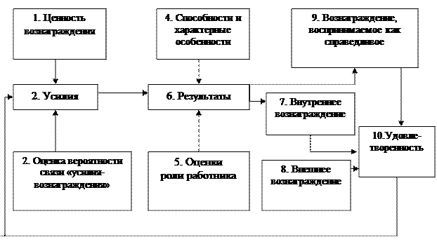3. Достижение требуемого уровня результативности (6) может повлечь вознаграждения: внутреннее (7) – чувство удовлетворения от выполнения работы, чувства компетентности и самоуважения, внешнее (8) - похвала руководителя, премия, продвижение по службе. Пунктирная линия между (6) и (9) означает, что может существовать связь между результативностью сотрудника и выдаваемым ему вознаграждением.