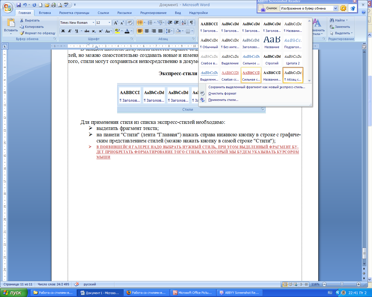 Ø в появившейся галерее надо выбрать нужный стиль, при этом выделенный фрагмент будет приобретать форматирование того стиля, на который мы будем указывать курсором мыши
