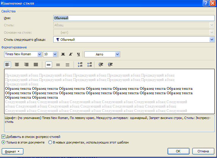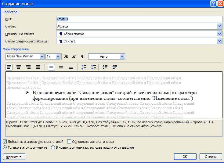 Ø В появившемся окне "Создание стиля" настройте все необходимые параметры форматирования (при изменении стиля, соответственно "Изменение стиля")