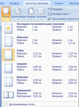 Кнопка "Поля" служит для установки значений полей документа. Если из предложенных стандартных вариантов ни один не подходит, необходимо воспользоваться пунктом меню "Настраиваемые поля..". В появившемся окне можно произвести более тонкие настройки полей документа.