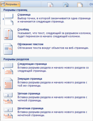 На этой вкладке собрано довольно много разнообразных вариантов разрыва не только страниц, но и разделов. Так, например, с помощью разрыва страницы можно принудительно перенести текст в другую колонку (вариант "Столбец").
