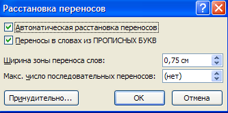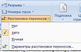 По умолчанию Word работает в режиме автоматического размещения текста: если слово не помещается в строке, оно переносится на следующую. Но, программа умеет расставлять и переносы слов. Для этой цели служит опция "Расстановка переносов". Возможны два варианта: Автоматическая настройка; Ручная настройка. Пункт "Параметры расстановки переносов" позволяет сделать тонкую настройку параметров расстановки переносов.