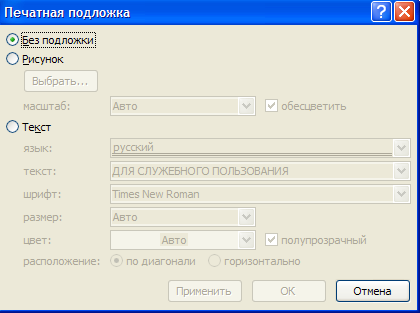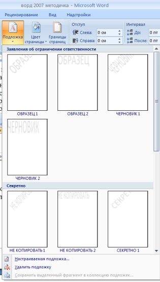 В Word 2007 имеется возможность добавлять подложку на страницы. В качестве подложки можно использовать текст или рисунок.