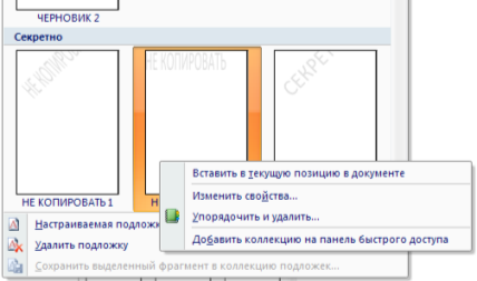 Можно отредактировать представленные в галерее стандартные подложки. Для этого надо щелкнуть на выбранном варианте правой кнопкой мыши и выбрать команду "Изменить свойства". Удалить подложку из галереи можно с помощью пункта "Удалить подложку".