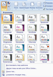 В Word 2007 добавлена еще одна функция - темы оформления, которые можно применять к текстовым документам. На вкладке "Темы", нажав кнопку "Темы" можно попасть в галерею, содержащую несколько вариантов оформления документа.