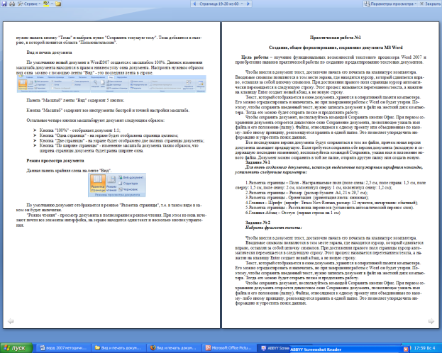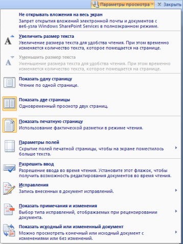 "Режим чтения" - просмотр документа в полноэкранном режиме чтения. При этом из окна исчезают почти все элементы интерфейса, на экране находится один текст и несколько кнопок управления.