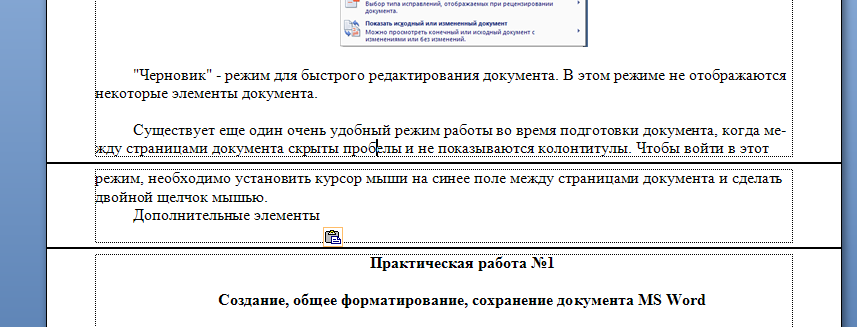 Существует еще один очень удобный режим работы во время подготовки документа, когда между страницами документа скрыты пробелы и не показываются колонтитулы. Чтобы войти в этот режим, необходимо установить курсор мыши на синее поле между страницами документа и сделать двойной щелчок мышью.