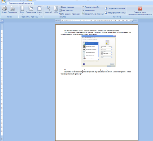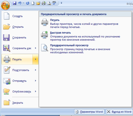 После того как документ набран и отформатирован в 99% случаев его нужно вывести на печать. Для этого служит пункт "Печать", находящийся в меню кнопки "Office" (сочетание клавиш Ctrl+P).
