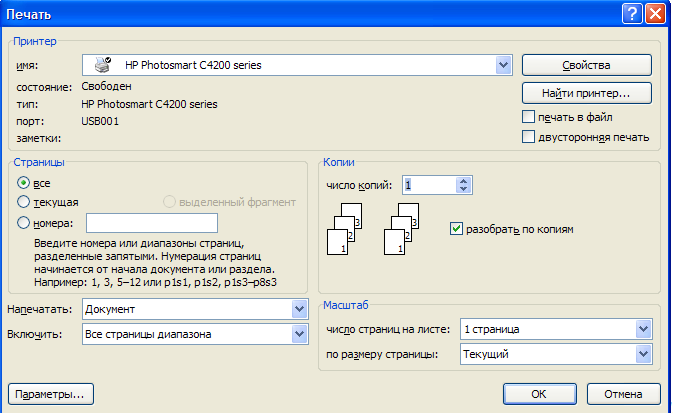 "Имя принтера" - актуально, если к вашему компьютеру подключено несколько принтеров или же компьютер подключен к сети, содержащей несколько принтеров. Тогда из выпадающего списка необходимо выбрать тот принтер, на который будет выводиться документ.