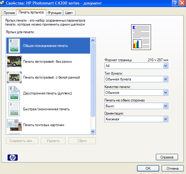 Для настройки принтера служит кнопка "Свойства" (следует иметь ввиду, что для разных моделей принтеров окно будет выглядеть по-разному).
