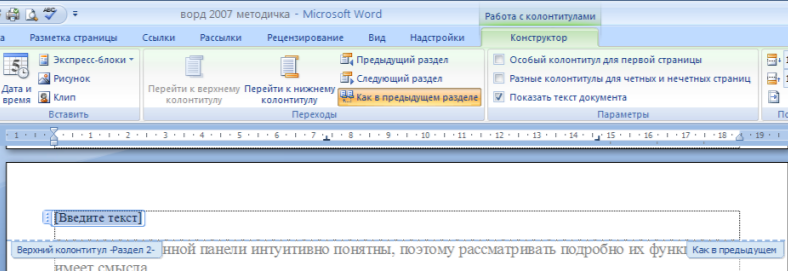 После вставки колонтитул доступен для редактирования, при этом появляется контекстная лента "Конструктор" (Работа с колонтитулами).