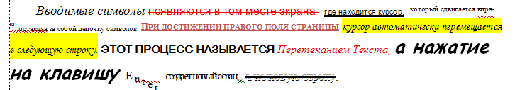Вводимые символы (Times New Roman, 14,К) появляются в том месте экрана (Arial, 12,красный, зачеркнутый), где находится курсор,(Arial Narrow,10,подчеркнутый) который сдвигается вправо,(Times New Roman,12, надстрочный) оставляя за собой цепочку символов.(Times New Roman,12, подстрочный) При достижении правого поля страницы (Times New Roman,10, подчеркнутый,Ж, темно-красный,малые прописные,разреженный на 0,25пт)курсор автоматически перемещается в следующую строку. (Monotype Corsiva,заливка цветом - желтый, 12) ЭТОТ ПРОЦЕСС НАЗЫВАЕТСЯ (Arial Unicode MS, 12,Ж,все прописные) Перетеканием Текста (Times New Roman, 12,К,красный,начинать с прописных), а нажатие на клавишу (Comic Sans MS, 20) Enter(Times New Roman,12, интервал –разреженный на 2пт, смещение каждого знака вниз на 3пт,относительно предыдущего) создает новый абзац,(Times New Roman,12, интервал -уплотненный на 1,5 пт) а не новую строку.(Times New Roman,12, двойное зачеркивание,утопленный)