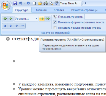 Основное удобство при просмотре документа в этом режиме заключается в том, что есть возможность настраивать отображение любого уровня структуры, скрывая при этом те уровни, которые занимают более низкую иерархию. Для этого надо всего лишь выбрать нужный уровень из выпадающего списка "Показать уровень".