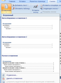 Для того чтобы быстро сделать оглавление документ должен быть отформатирован согласно встроенных форматов уровней структуры или стилей заголовков.