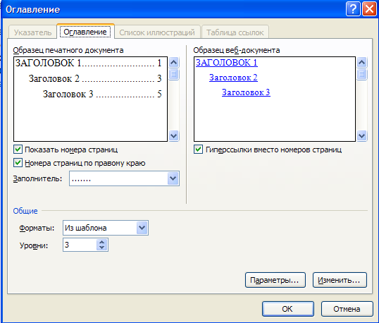 При необходимости тонких настроек оглавления нажмите "Оглавление.."