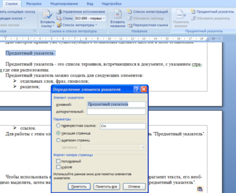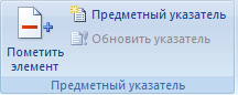 Чтобы использовать в качестве предметного указателя какой-либо фрагмент текста, его необходимо выделить, затем нажать кнопку "Пометить элемент" на панели "Предметный указатель".