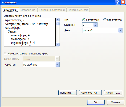 Для окончательной сборки предметного указателя нажмите кнопку "Предметный указатель" и при необходимости в появившемся окне произведите окончательные настройки.