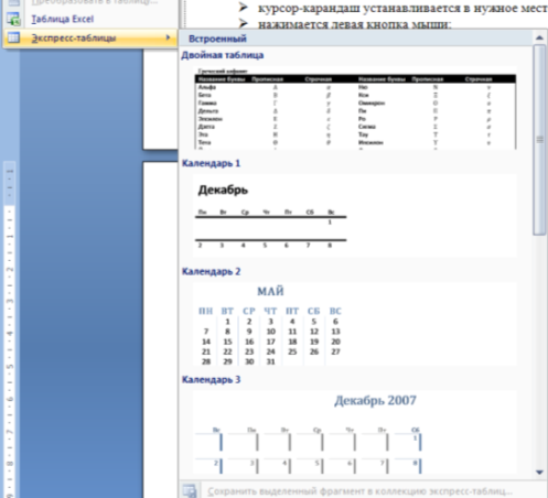 Кроме вышеупомянутых вариантов создания таблицы Word 2007 предоставляет несколько вариантов уже готовых экспресс-таблиц.