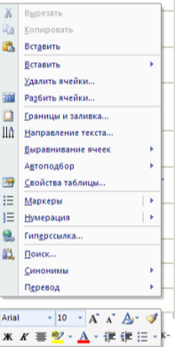 Наиболее часто применяемые команды при работами с ячейками таблицы доступны в контекстном меню ячейки, которое вызывается правым щелчком мыши.