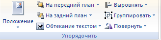 Инструменты, расположенные на панели "Упорядочить" предназначены для настройки параметров взаимодействия фигуры с текстом документа.