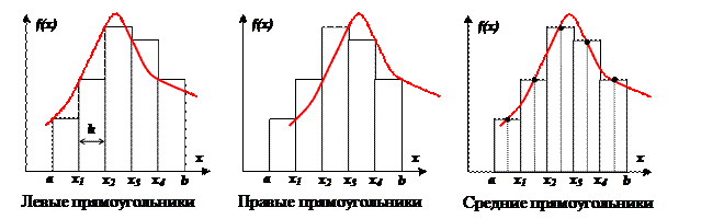 Различают метод левых, правых и средних прямоугольников. Суть метода ясна из рисунка. На каждом шаге интегрирования функция аппроксимируется полиномом нулевой степени – отрезком, параллельным оси абсцисс.