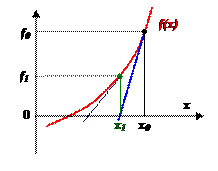 Уравнение касательной, проведенной из точки (x 0, f 0): y (x) = f /(x 0)(x – x 0) + f (x 0) дает для y (x 1) = 0 следующее выражение: