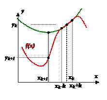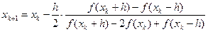 Это эквивалентно аппроксимации функции параболой, проходящей через три близкие точки x k+ h, x k, x k– h. Окончательное выражение, по которому можно строить итерационный процесс, таково: