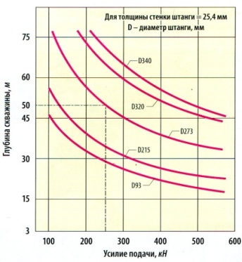 | Рис 3.1. Зависимость допустимой глубины скважины (длина бурового става) от усилия подачи для штанг различного диаметра при толщине их стенки 25,4 мм. |
