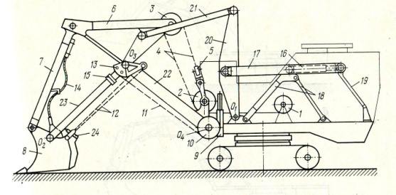 Мачта напорным звеном 21 передает усилие на раму 6. Гидрозамок 9 через канат 11, профильный полублок 13 и канат 12 удерживает ковш 8 от поворота по часовой стрелке вокруг оси О 1, укрепленной на рукояти 23 ковша. Возврат ковша в исходное положение осуществляется под действием сопротивления копанию или поворотом рамы 6 относительно оси О 3 механизмом подъема или напора. Последние передают усилия через звено 7, а ковш поворачивается относительно оси О 2 до полного выбирания слабины каната 14. Стрела 22 может подниматься и опускаться, поворачиваясь вокруг шарнира О 4, за счет перемещения мачты 20. При разгрузке ковша его днище открывается с помощью пневмоцилиндров 24, установленных на задней стенке ковша.