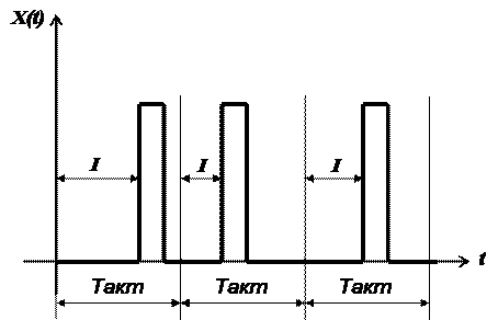 Рис.6. Импульсный сигнал (аналоговый, прерывистый), информационный параметр (I) – фаза (положение импульса в пределах такта).