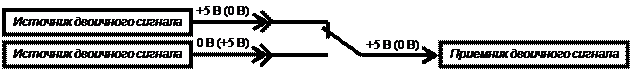 В цифровых системах информационный процесс на физическом уровне обеспечивается с помощью двоичных сигналов. Это связано с тем, что в основе всех цифровых схем лежит так называемый ключ (переключатель), который осуществляет коммутацию двух уровней напряжения. «Высокого», например +5 В и «низкого» - 0 В. Работу такого ключа можно проиллюстрировать на примере работы обычного электромеханического переключателя (ключа) (рис.7).