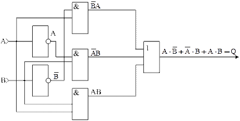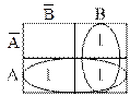 , что также является дополнением и поэтому во втором контуре остается один член В. Полученное таким образом в каждом контуре выражение объединяются логической функцией «сложение». В результате получим упрощенное выражение А + В.