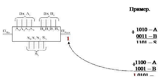 Сумматоры – схема складывает четырехразрядное двоичное число Аi c четырехразрядным двоичным числом Вi и на выходе формирует двоичную сумму Si. Для расширения сумматора в схеме предусмотрен вход переполнения Пвх и выход переполнения Пвых. На схемах электрически – принципиальных изображают следующим образом: