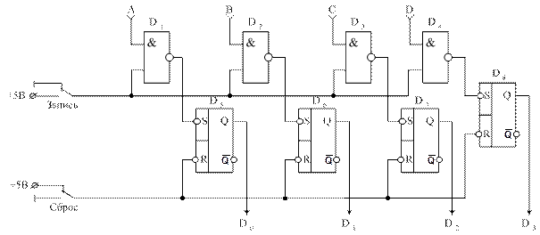 Схема предназначена для хранения двоичной информации в параллельном входе на выходах D0 … D3 и поступления на входа A, B, C и D. Запись и перезапись информации в регистре осуществляется с помощью управляемых сигналов «Запись» и «Сброс».