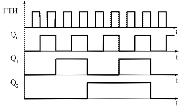 изменит свое состояние из 1 в 0 – задний фронт, поэтому третий триггер своего состояния не изменит. В результате имеем, Q0=0, Q1=1, Q2=0. Нетрудно видеть, что двоичный счетный код на выходе счетчика точно равен количеству (N) тактовых импульсов от ГТИ на входе счетчика.
