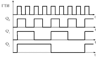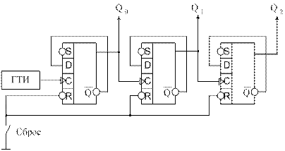 Строится так же, как и счетчик на сложение с той лишь разницей, что каждый следующий триггер тактируется не от инверсного выхода предыдущего, а от прямого выхода.