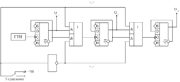 , т.е. «а». На выходе элемента 2 – ИЛИ будет 0 + «а», т.е. «С» = «а». Если ключ «Управление» переключить, то на 2 верхнем входе элемента 2 - И будет 0 и на выходе его будет 0. На втором входе нижнего элемента 2 – И через инвертор подается 1, следовательно, выход этого элемента будет равен «в». 0 + «в» на элементе 2 – ИЛИ на выходе даст «в» = «С». И в этом случае на С – вход следующего триггера подаются тактирующие импульсы от инверсного выхода предыдущего триггера, счетчик будет работать на сложение.