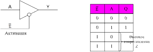 Интегральные элементы семейства ТТЛ (транзисторно-транзисторная логика) используются очень широко, значение выхода устройства ТТЛ может быть либо логической 1 (2, 4 ÷ 5 В), либо 0 (0 ÷ 0,4 В), поэтому невозможно подсоединить выходы стандартных элементов на общую шину ЭВМ. Поэтому были разработаны специальные элементы, выходы которых могут быть объединены на общей шине. Эти элементы называют тристабильными (имеющими 3 состояния). Этим элементам присуще состояния на выходе логического нуля, логической единицы и особое состояние высокого сопротивления Z. Когда тристабильный элемент находится в состоянии высокого сопротивления Z, его выход отключен от шины.